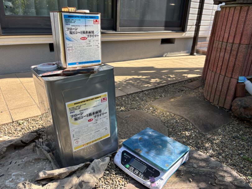 ↑塩ビシート用のプライマーを塗布します。